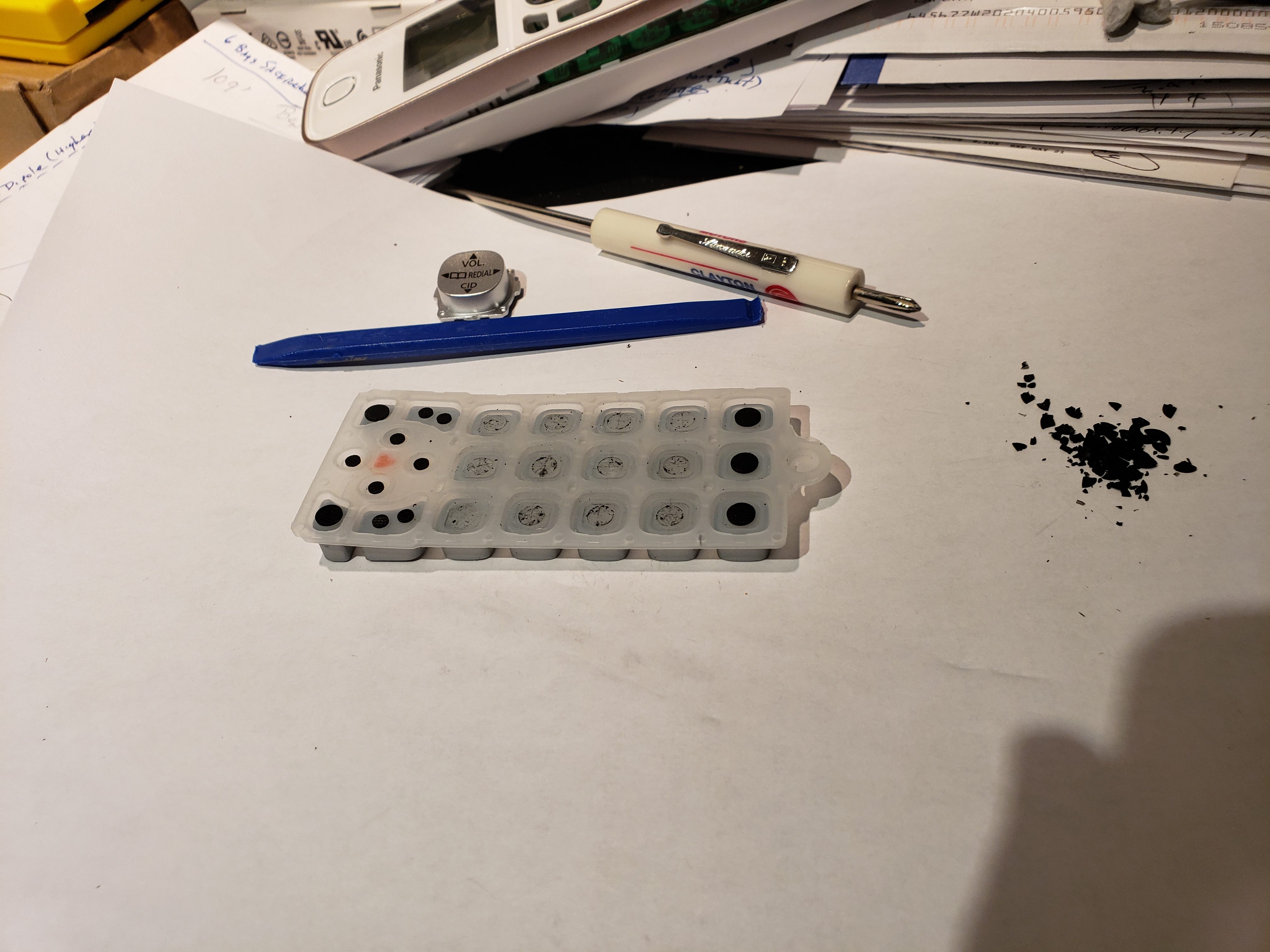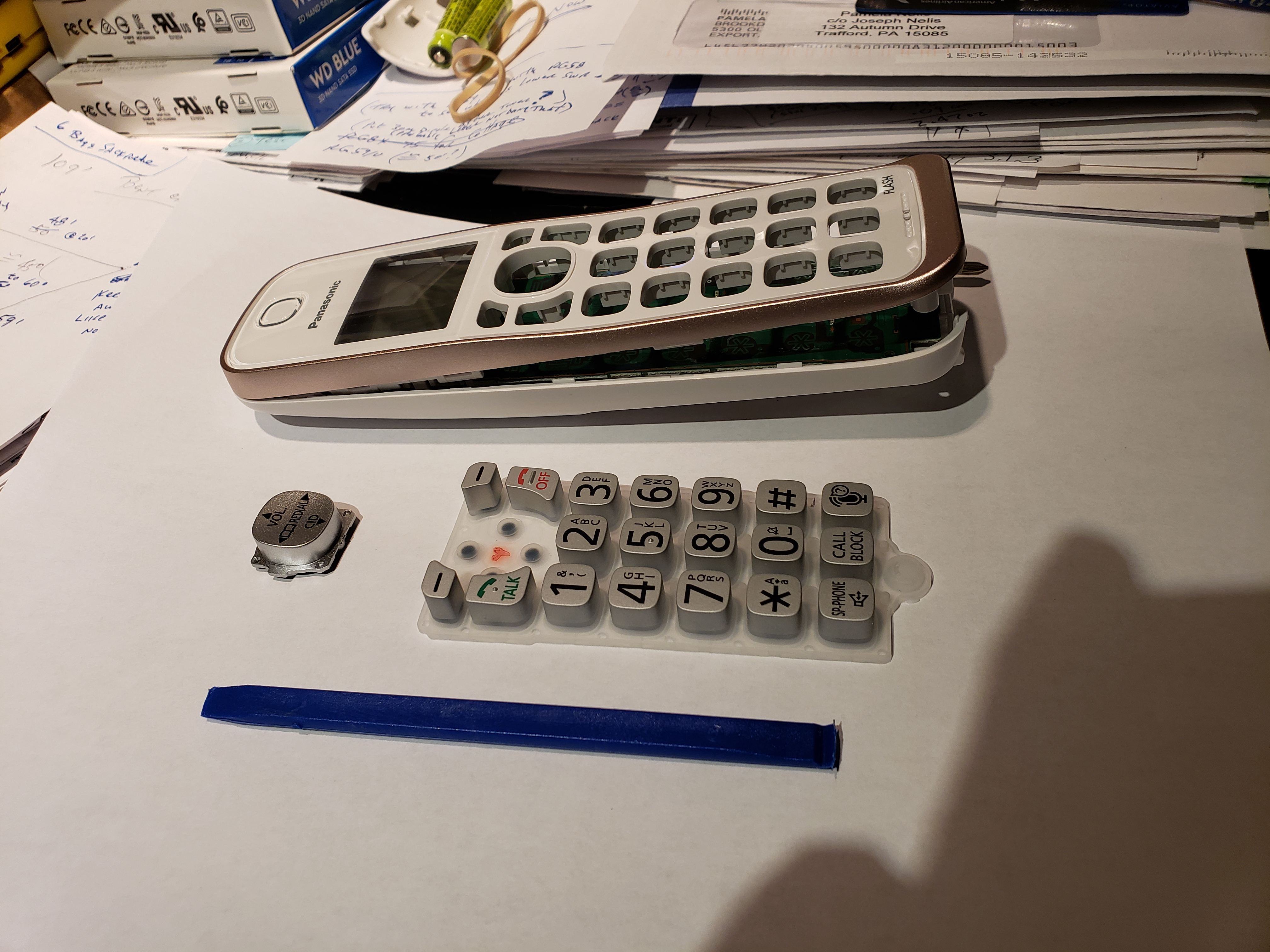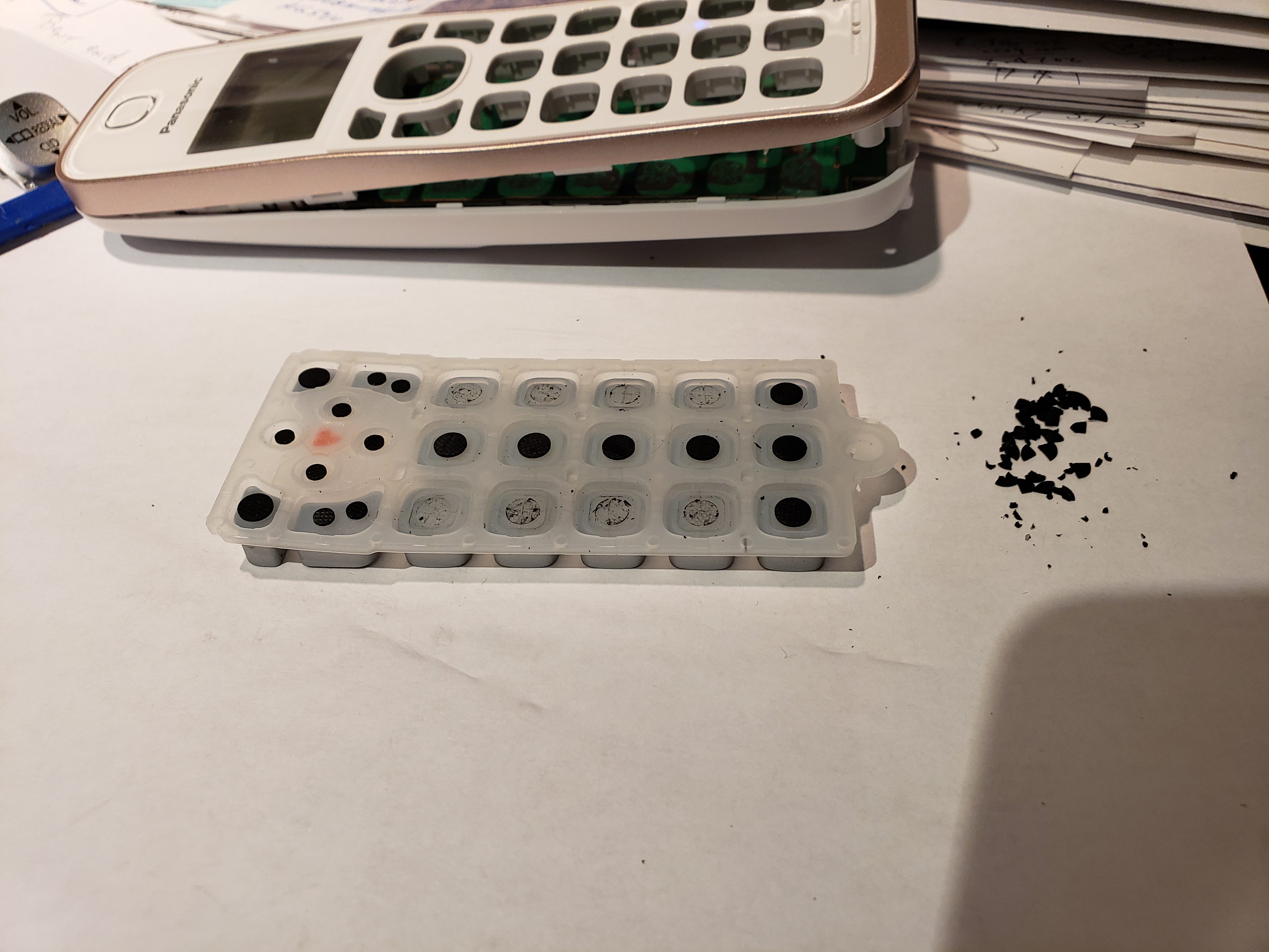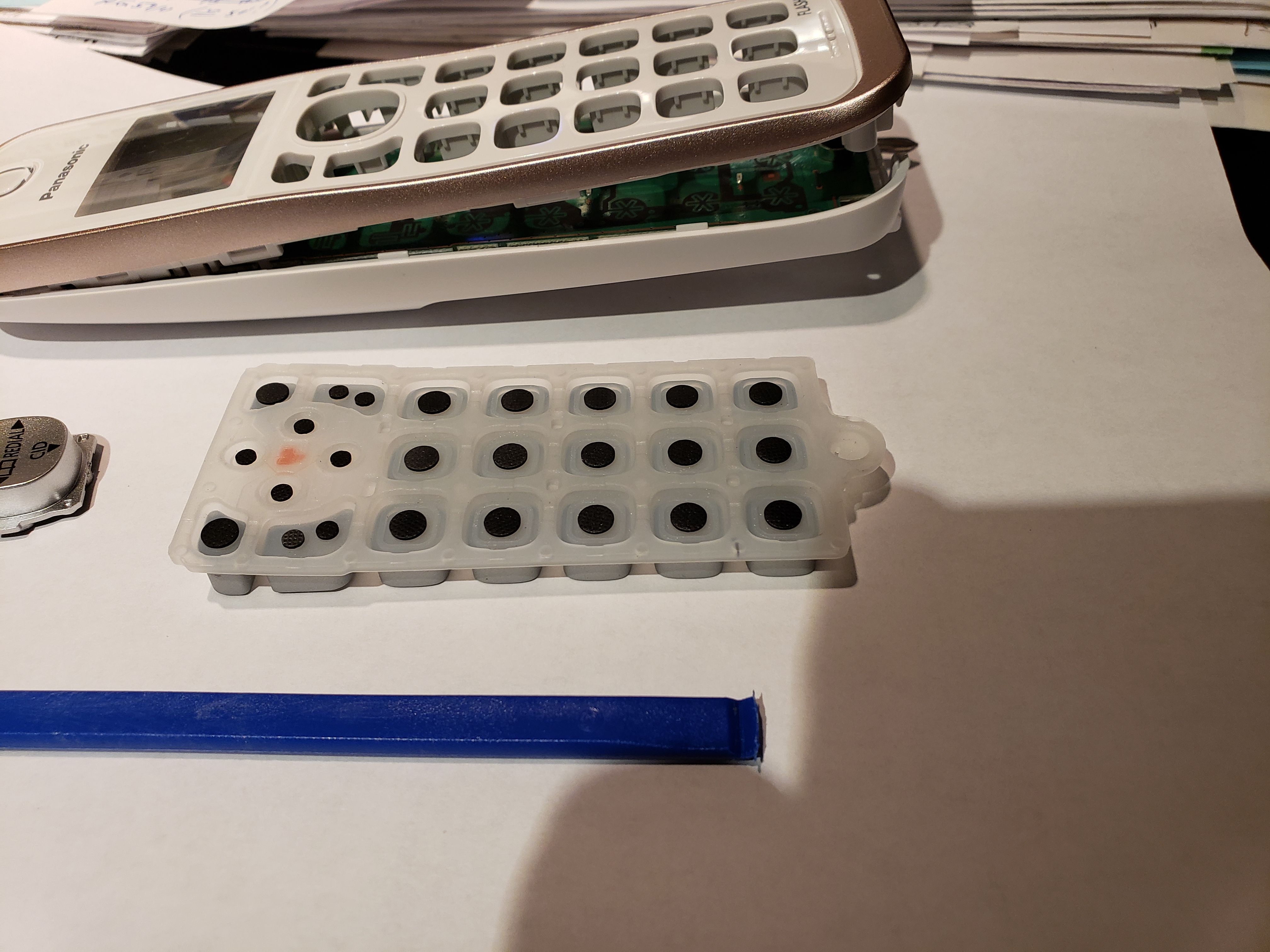 She is using a Panasonic KX-TGD562G Cordless Phone. Fortunately, disabling the numeric buttons on that model was not terribly difficult to do. Like many consumer electronic devices, there are conductive ‘pills’ underneath the buttons. Whenever the buttons are pressed, those conductive pills are then pressed against the printed circuit board that is below the buttons and that completes a circuit. I suppose there are various ways of disabling these buttons. I chose to remove those conductive ‘pills’ from the bottom of those ten buttons. The steps required to do that for this particular brand/model are shown below.