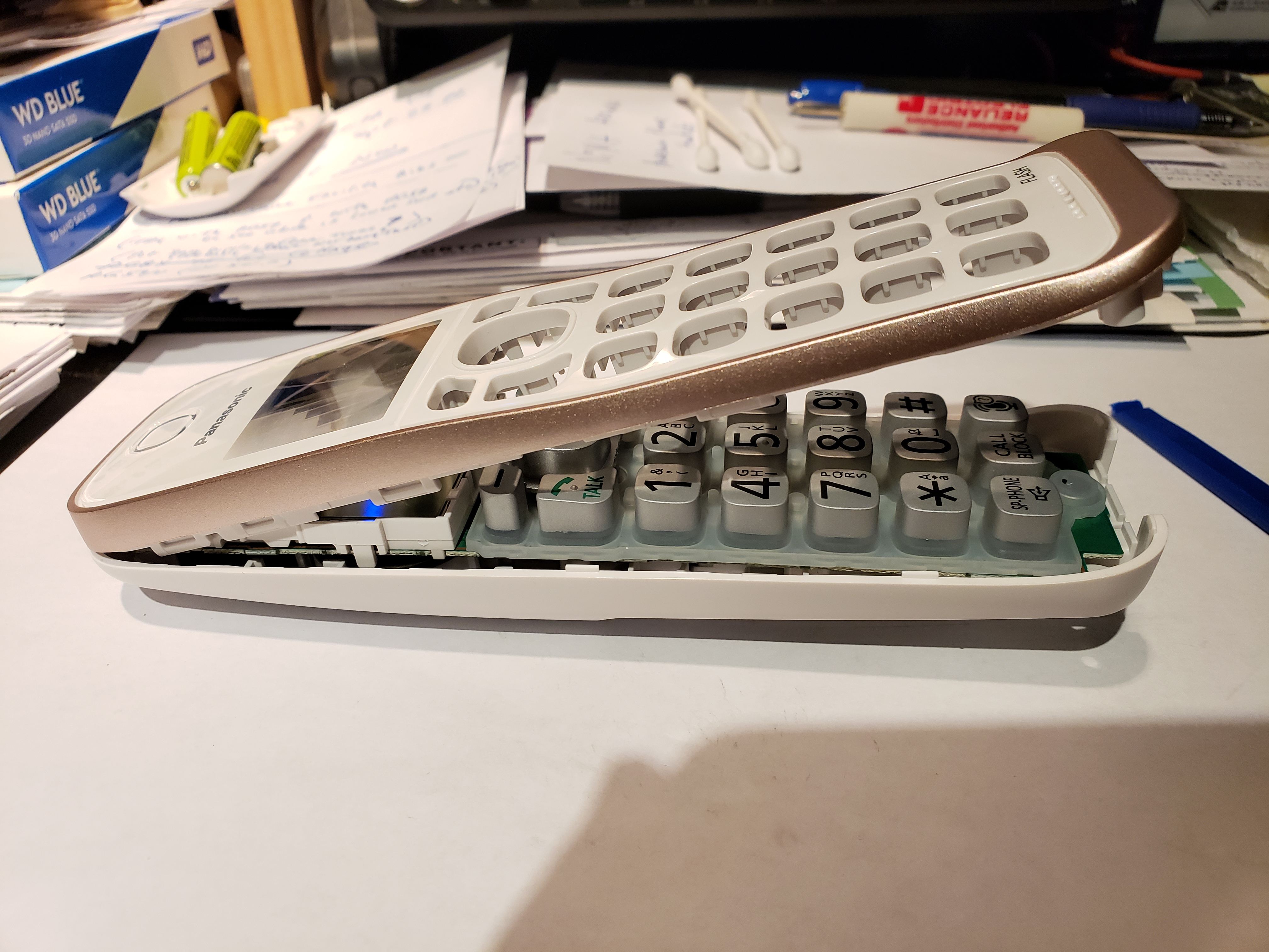 NOTE: The Panasonic KX-TGD562G Cordless Phone System that I purchased was an Answering Machine and had two handsets. Certain setup functions, like entering a custom answering message, require the use of a handset that still has all of the numeric buttons working. So, I only modified one handset to make it Answer-Only. I kept the other unmodified handset at home to allow me to do the setup functions when required.