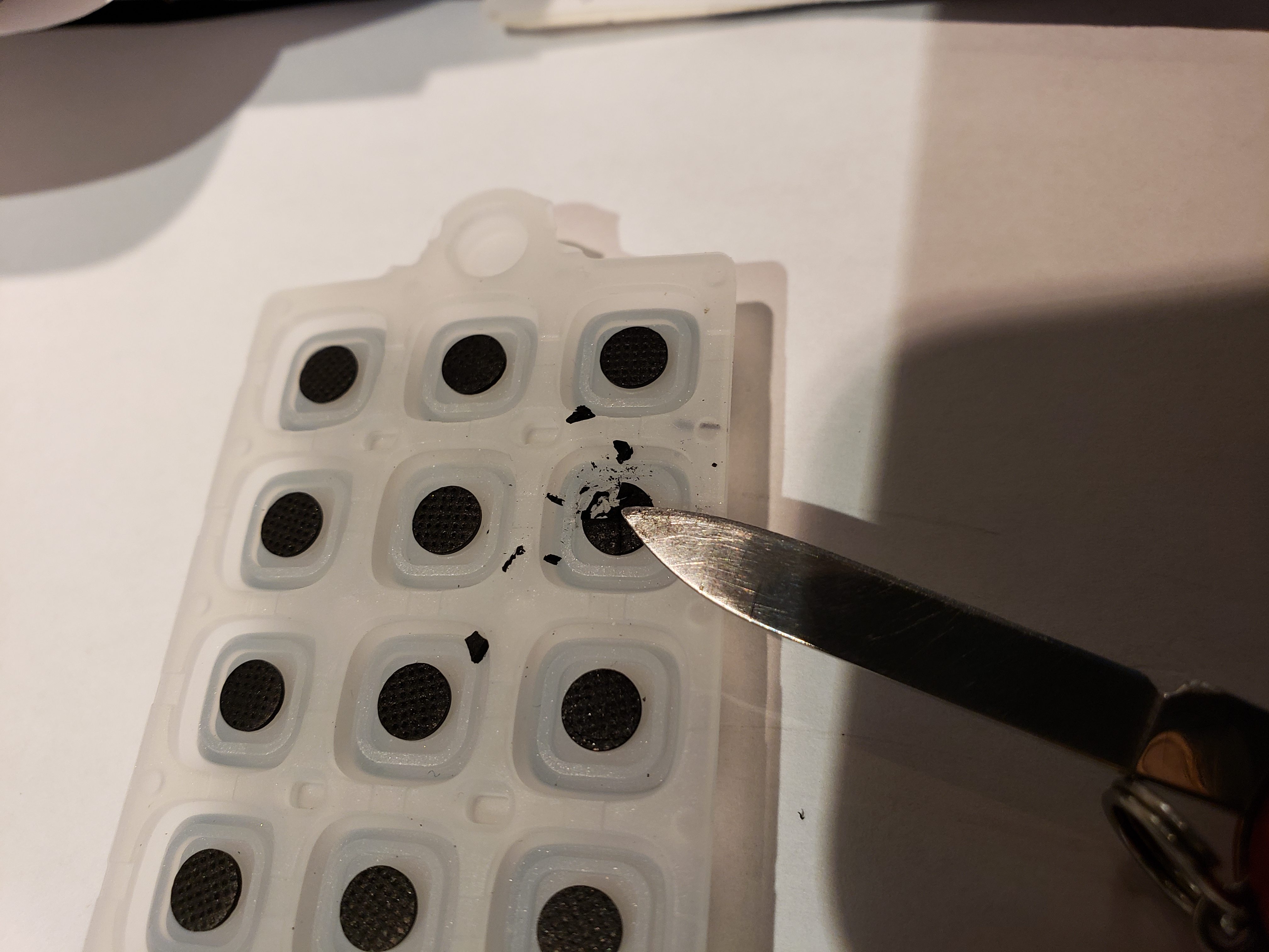Use a Q-Tip and some rubbing alcohol to clean up any residual glue still on the membrane. Make sure no fragments of the conductive pills are still in any of the other buttons. Tweezers can be helpful.