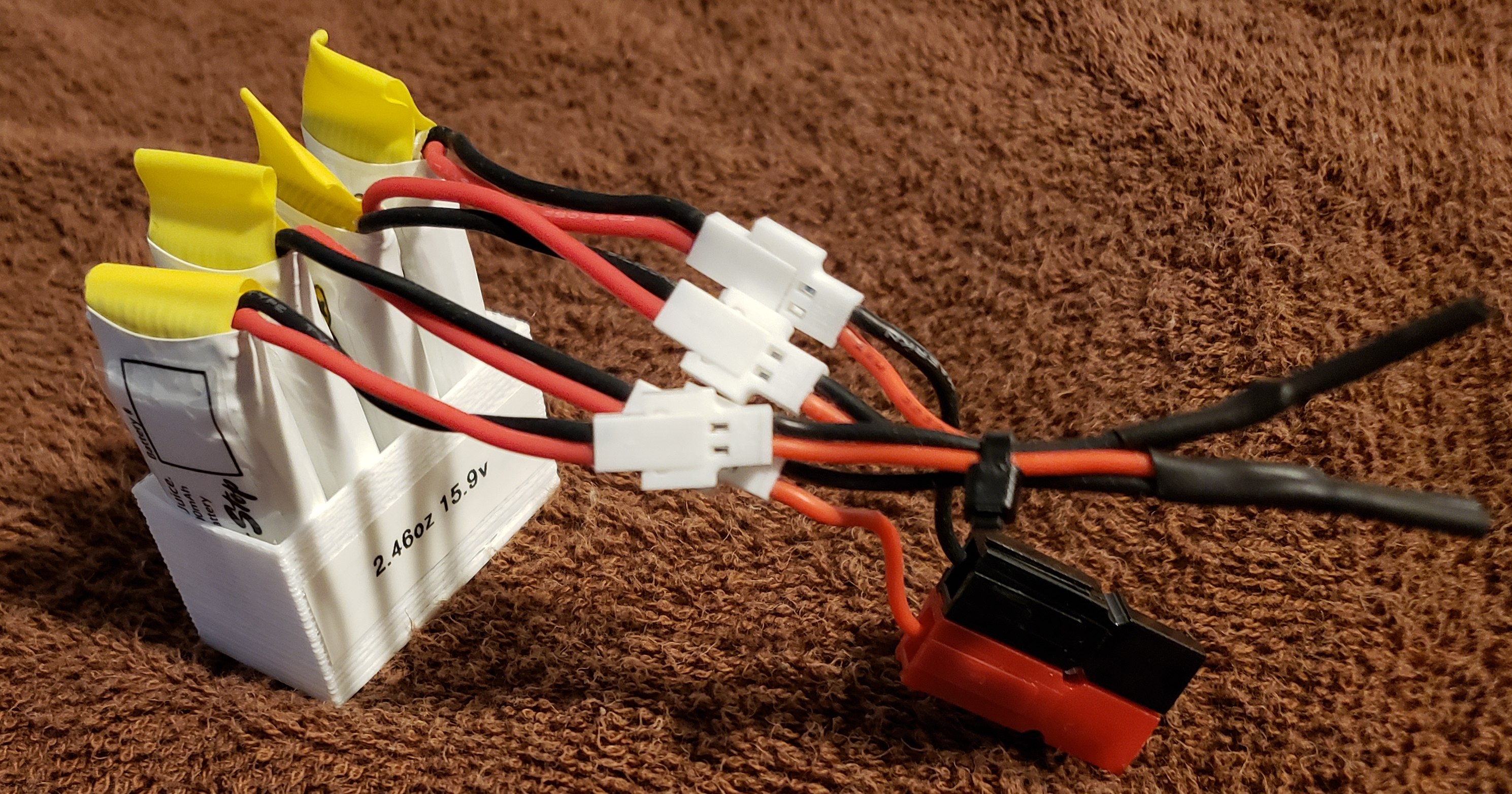 Trying to get a little lighter with my QCX Station, I tried some small 3.6v LiPo batteries that were made for use in a small quad copter. The pack of four weighs 2.46 oz, making my total station weight 8.66 oz or 0.541 pounds. (I keep using Power Pole connectors out of convenience - If I was trying to be even more competitive, I would eliminate that 'extra weight'). I was hoping to get more than 3 watts with this LiPo battery pack that has a higher voltage than my NiMH battery pack has. But I do not - they must be current limiting. But 3 watts gets the job done. The four LiPo batteries are wired in series: