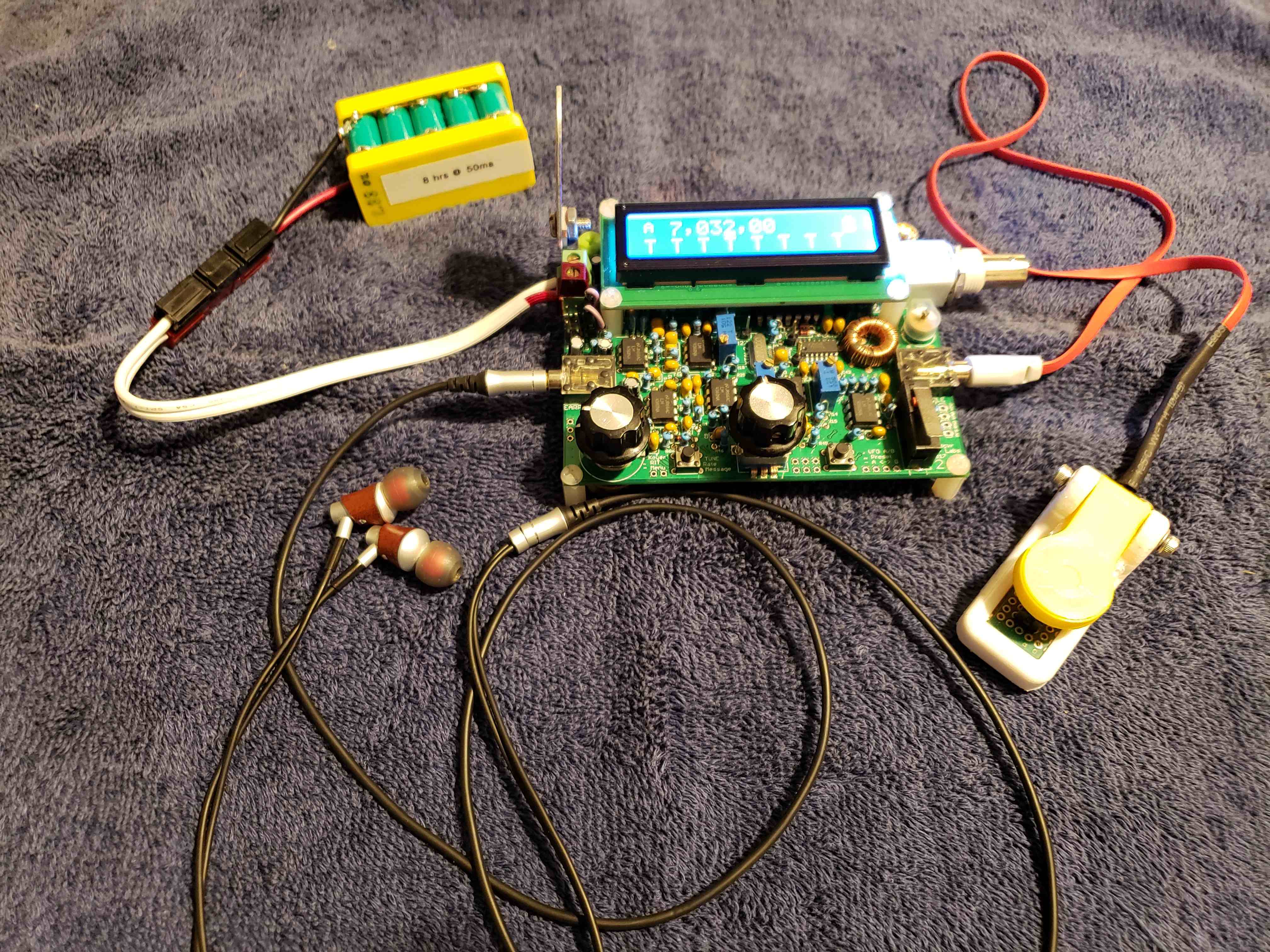 My goal was to be as light as possible. The total weight of the components shown here is 9.1 ounces, which is 0.569 pounds. So, if I make 5 QSOs, my score is 5 / 0.569 or 8.79. The Naked QCX is 5.0 oz. The ear buds and 3D Printed Key are 0.4 oz and 0.8 oz. The difficult thing is finding a light weight battery that will last a while. I settled on building a pack of ten 2/3 AAA NiMH batteries. That battery pack weighs 2.9 oz. I am able to run 3 watts with this particular setup.