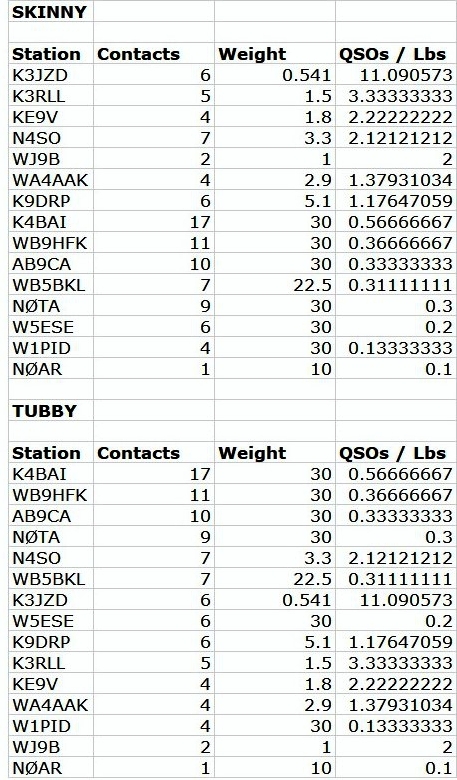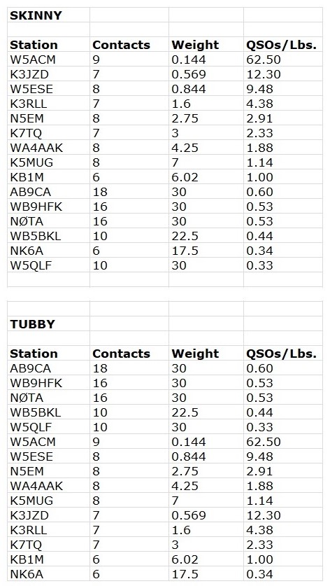 This event does not have a real big following. And not everyone who works it submits their score. W5ACM has a rather unique station. He is in a class by himself with a station that light. But, if he has a really bad night I can be competitive. But either way, it is all in fun, just trying to do the best you can with a small lightweight station.