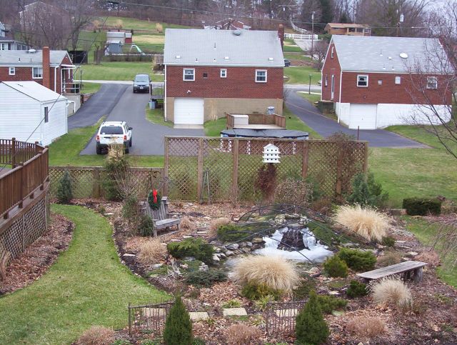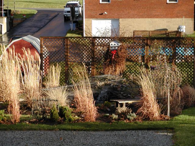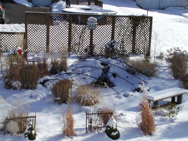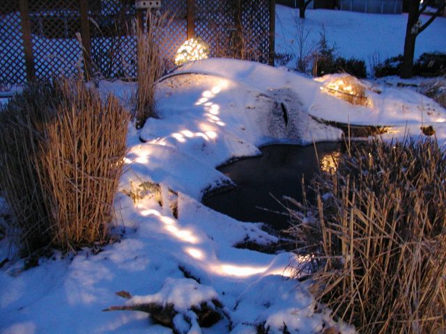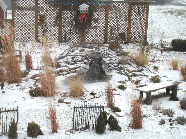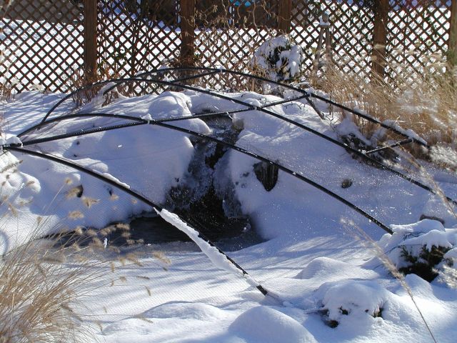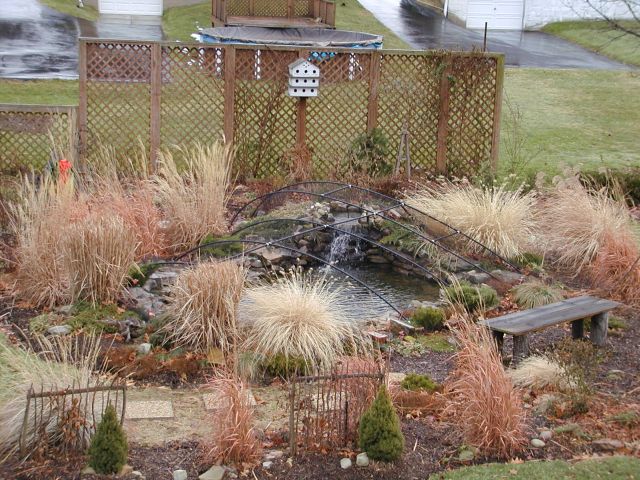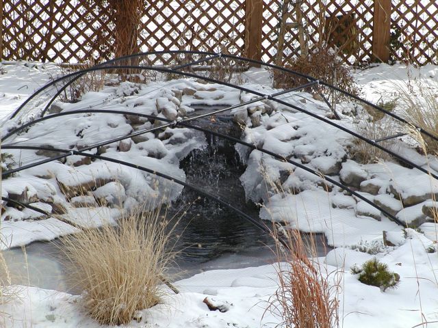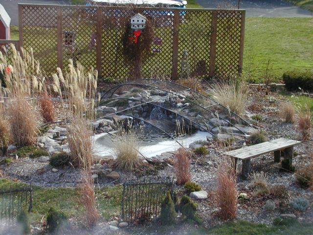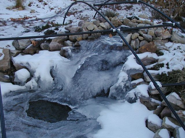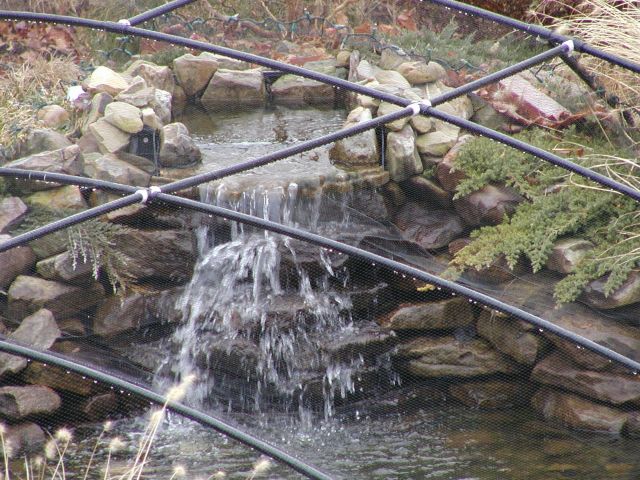 The net over the pond keeps the leaves and debris out. The water circulating pump runs year round.